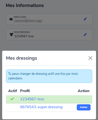 En cliquant sur tu peux accéder à une pop-up t'affichant tes dressings. Ceux activés sont affichés avec un fond vert et tu peux activer les autres avec le bouton activer comme le montre l'image ci-dessous :