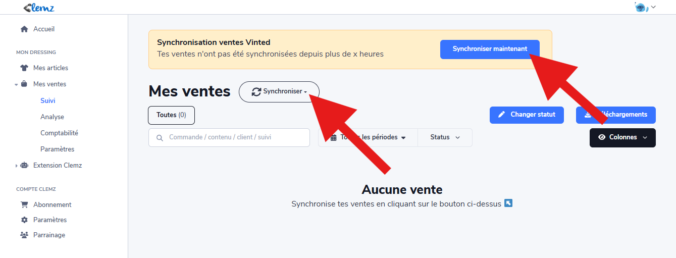 Accédez à la page Suivi du module "Ventes" de Clemz en cliquant sur "Mes ventes" puis "Suivi" (lien ici). Cette page peut vous proposer 2 boutons pour synchroniser vos ventes.